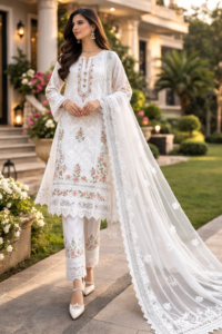 The shirt is made from premium quality lawn cotton fabric, known for its softness and breathability. It features delicate multi buti low embroidery with detailed panel work and full jaal design, creating a rich yet sophisticated look. The fine embroidery across the front adds depth and texture while maintaining a balanced and classy style.